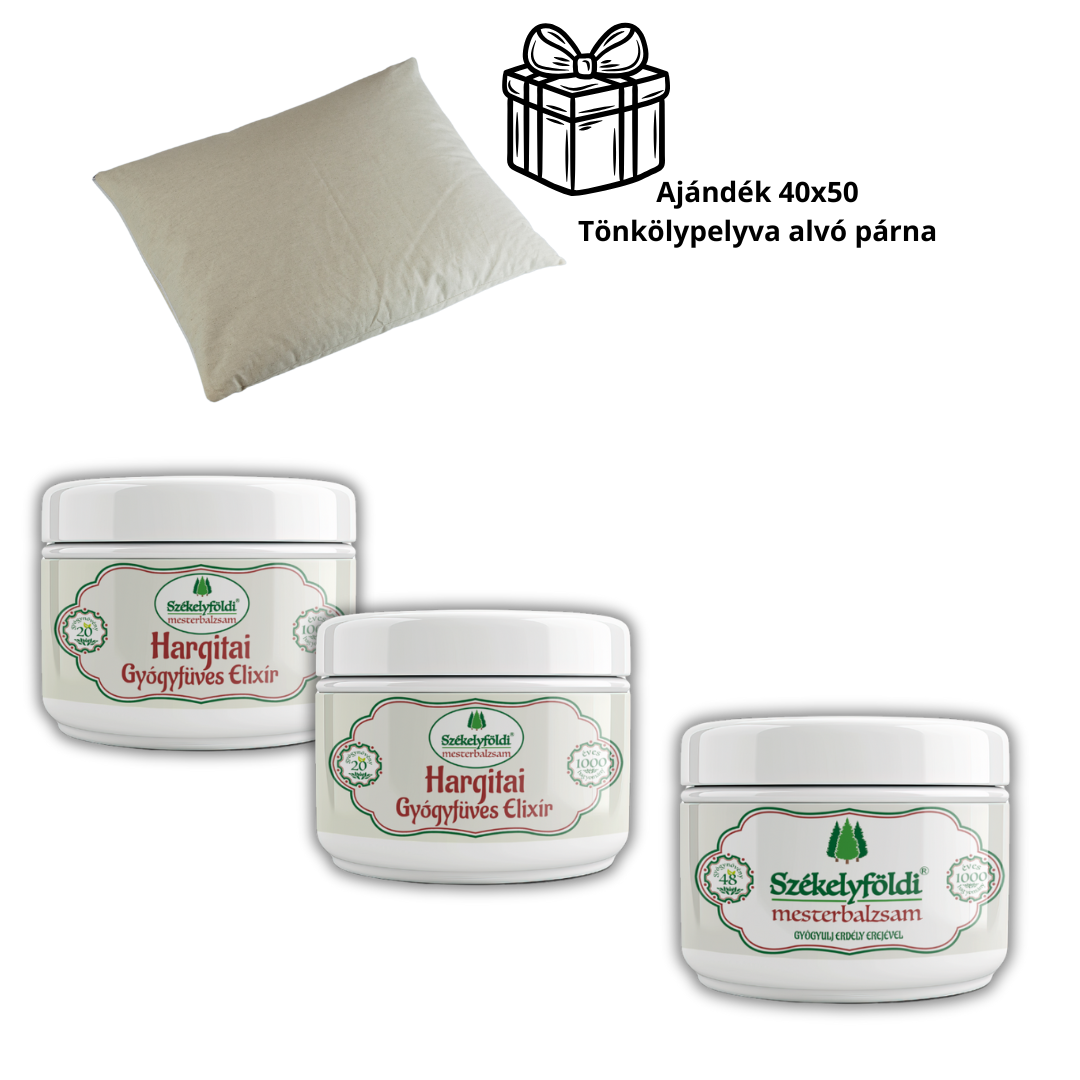 2 db Hargitai Gyógyfüves Elixír + 1 db Székelyföldi Mesterbalzsam + AJÁNDÉK Tönköly Pelyva Párna (40 x 50 cm)